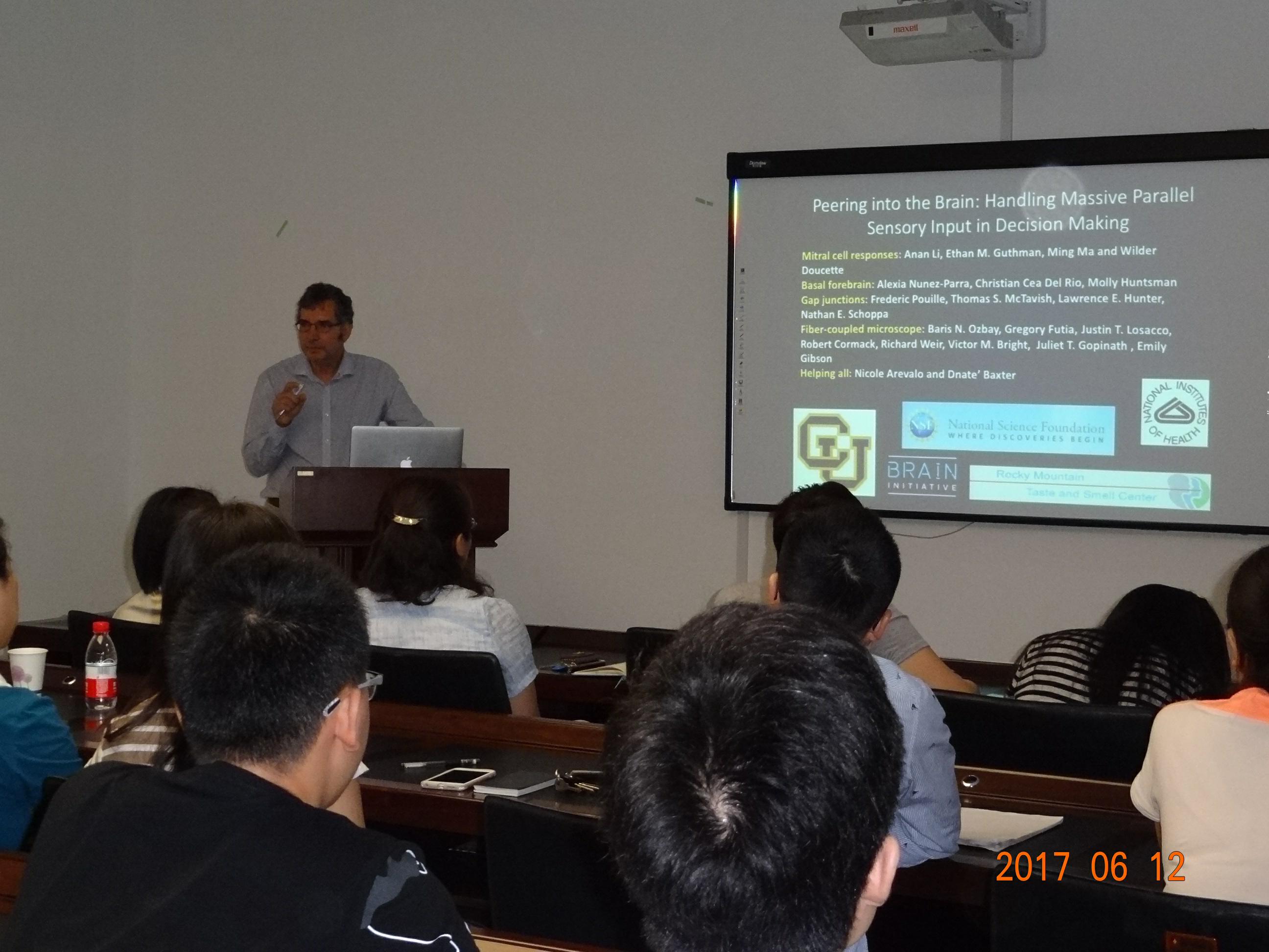 12日上午9:30在科教楼B302进行了学术交流报告,报告由李安安教授主持,基础医学院院长、江苏省脑病生物信息重点实验室主任侯筱宇教授等出席了此次学术交流报告。Diego Restrepo教授作了题为Peering into the brain: Handling massive parallel input in decision making的报告,报告内容主要分为三部分:(1)应用清醒行为动物多通道在体电生理技术及计算神经科学的方法研究脑状态调控嗅觉感知过程以及嗅觉相关的行为决策。(2)使用光遗传技术阐明基底前脑胆碱能神经元对嗅觉决策行为的调控作用。(3)在传统双光子成像基础上研究新的成像技术用于研究嗅球神经元的活动,开发光纤偶联成像技术,克服了以往只能对浅层的脑区神经元成像的缺陷,使研究深层脑区的神经元成为可能。参加报告会的还有重点实验室和麻醉学院的老师、生化专业研究生和博士后、我校其它专业的研究生及生物科学系部分学生,报告结束后各位老师和同学与Diego Restrepo教授针对相关问题进行了深入的交流与讨论。