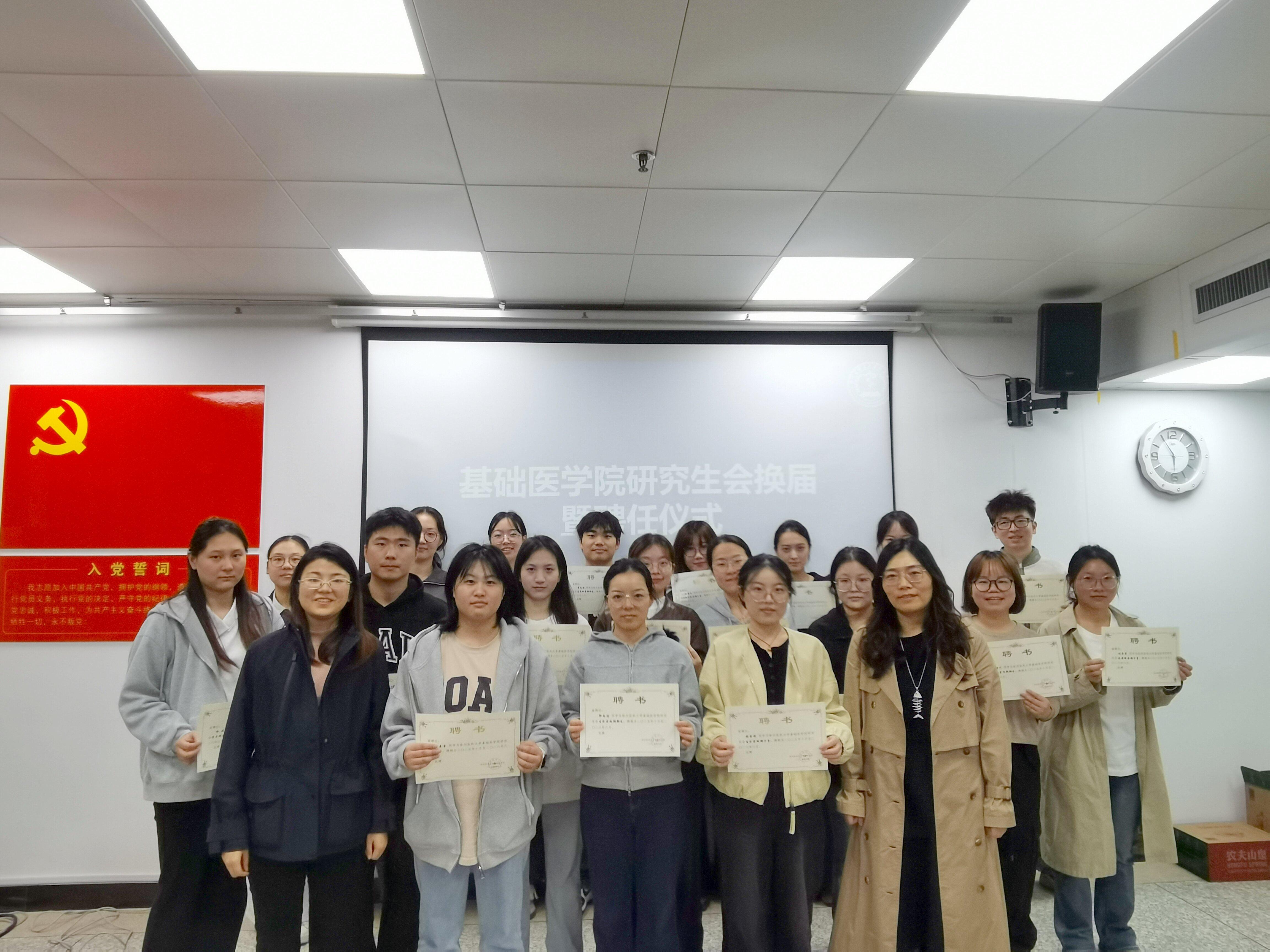 为加强学院研究生会成员间的交流与合作,凝聚研究生会骨干力量,增强团队凝聚力,基础医学院研究生会于10月16日在302会议室开展换届暨聘任仪式。学院党委书记韩红柳、辅导员王娜及全体研究生会成员齐聚一堂。
