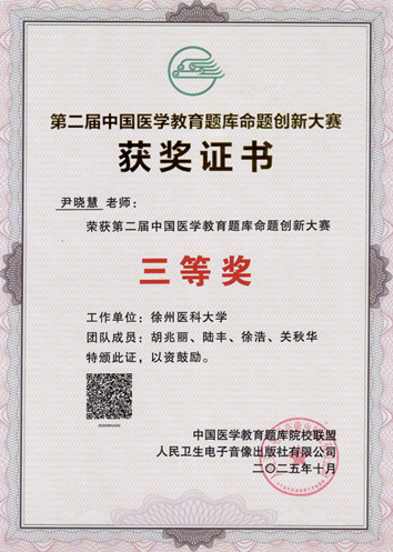 近日,由中国医学教育题库院校联盟、人民卫生电子音像出版社与中国医科大学联合主办的第二届中国医学教育题库命题创新大赛在北京圆满落幕。大赛吸引了来自全国29个省(自治区、直辖市)的63所院校,共计252个团队参与。我院尹晓慧老师团队凭借扎实的基础医学专业功底、创新的命题思路、高质量的原创试题作品荣获大赛三等奖。