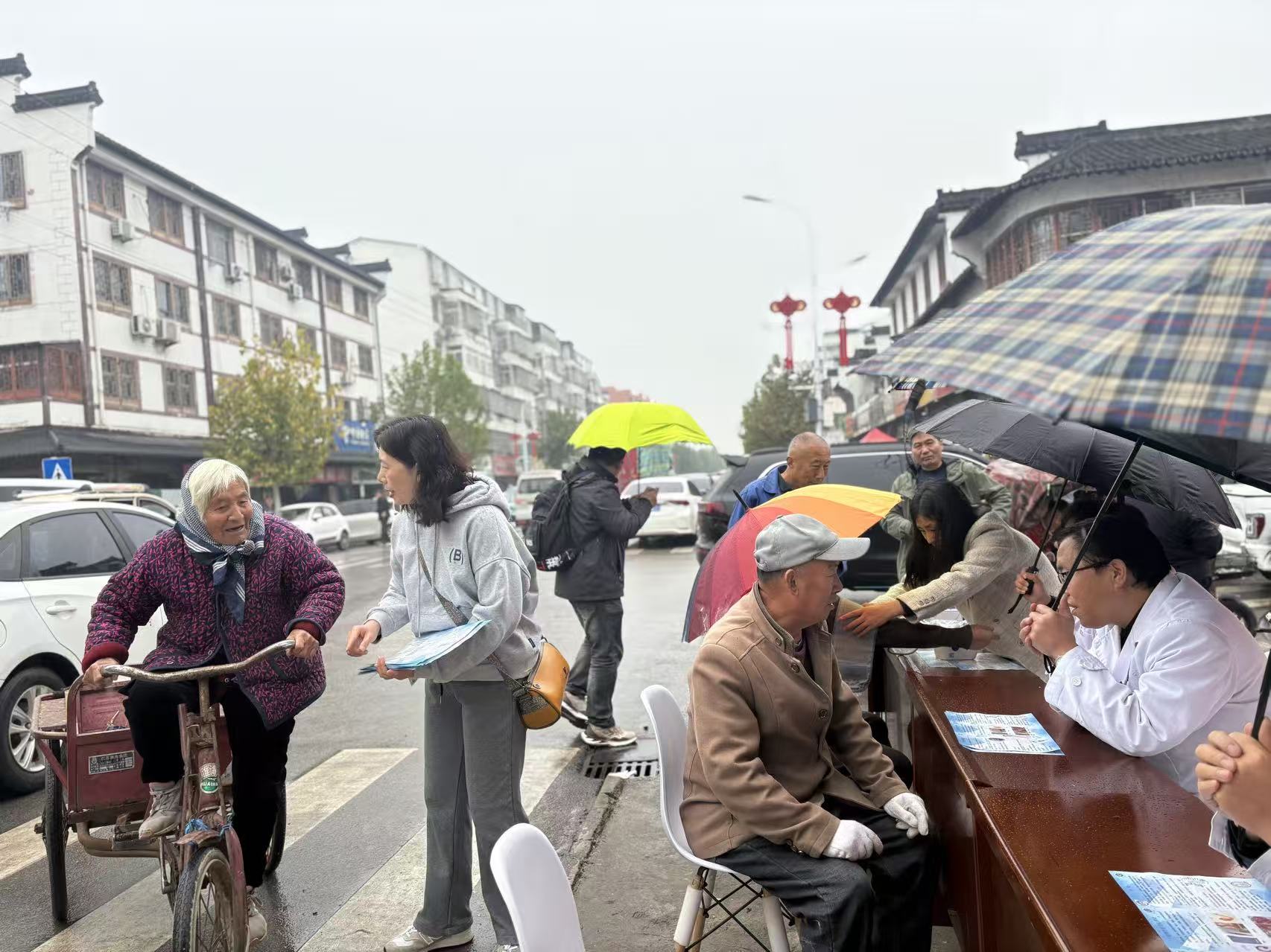 活动当天,尽管阴雨连连,气温下降,但这并未阻挡支部党员服务群众的热情。活动现场,医疗专家们耐心接待每一位村民,细致问诊、测量血压、查看检查报告,针对脑卒中、高血压、糖尿病、关节炎等乡村常见慢性病,逐一给出用药指导与饮食建议;党员志愿者则穿梭在雨棚内外,为行动不便的老人撑伞引路、协助完善问诊信息,向村民发放《常见疾病防控小知识》宣传手册,普及呼吸道疾病、脑卒中、食源性寄生虫感染的预防等知识,用热情与细心化解了阴雨天气的清冷。