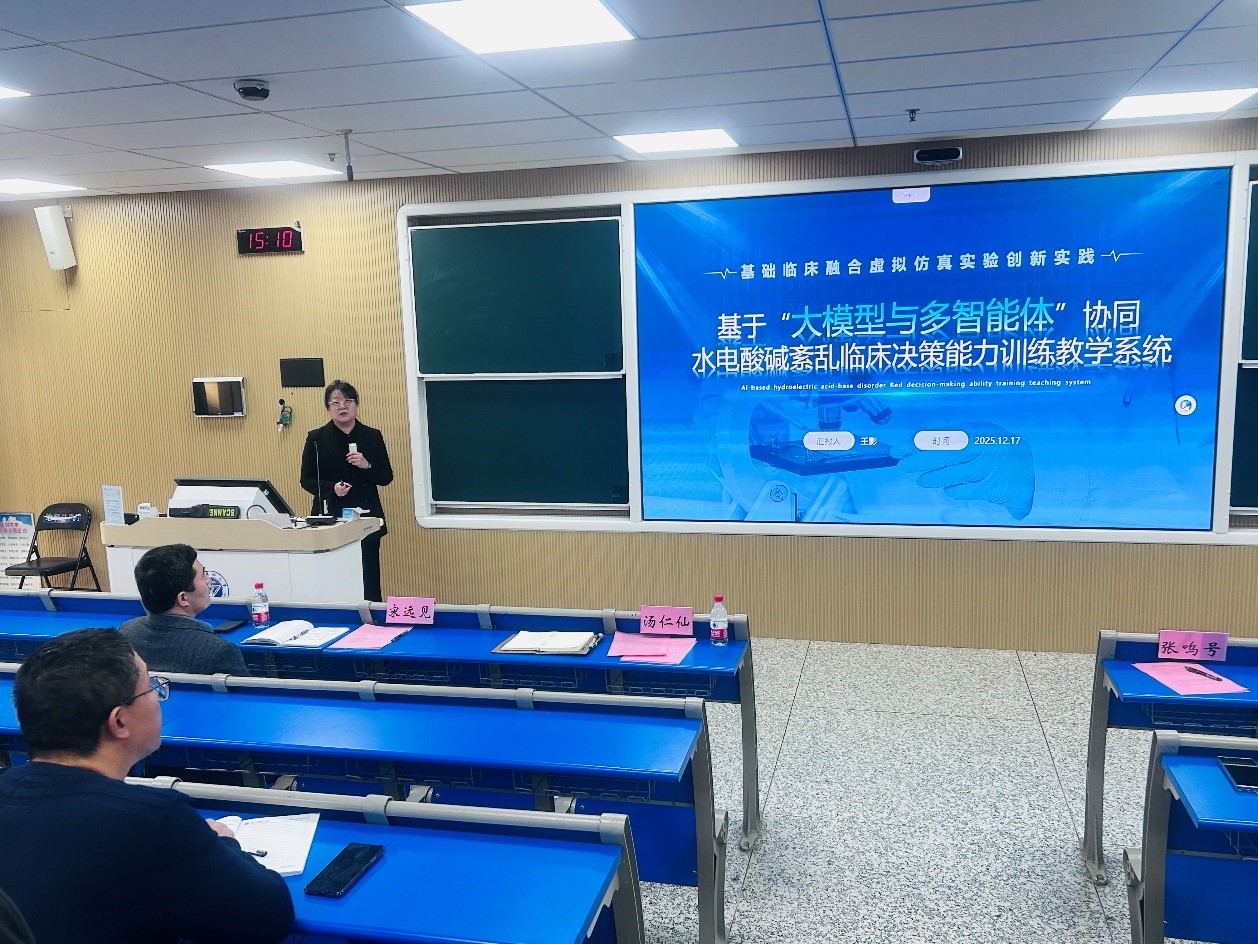 基础医学院病理生理学教研室王影副教授以《基于“大模型与多智能体”协同水电酸碱素乱临床决策能力训练教学系统》为题作报告。报告秉持“虚实结合、以虚补实”的核心理念,凸显AI深度赋能:构建“师、生、机”三元协同的探究式教学场景,大幅提升学生课堂参与积极性,系统形成完整的“学习-实践-反馈”闭环优化体系,推动学生实现从知识记忆到能力构建的核心转变,为基础医学实践教学改革提供了更具实操性的高效解决方案。