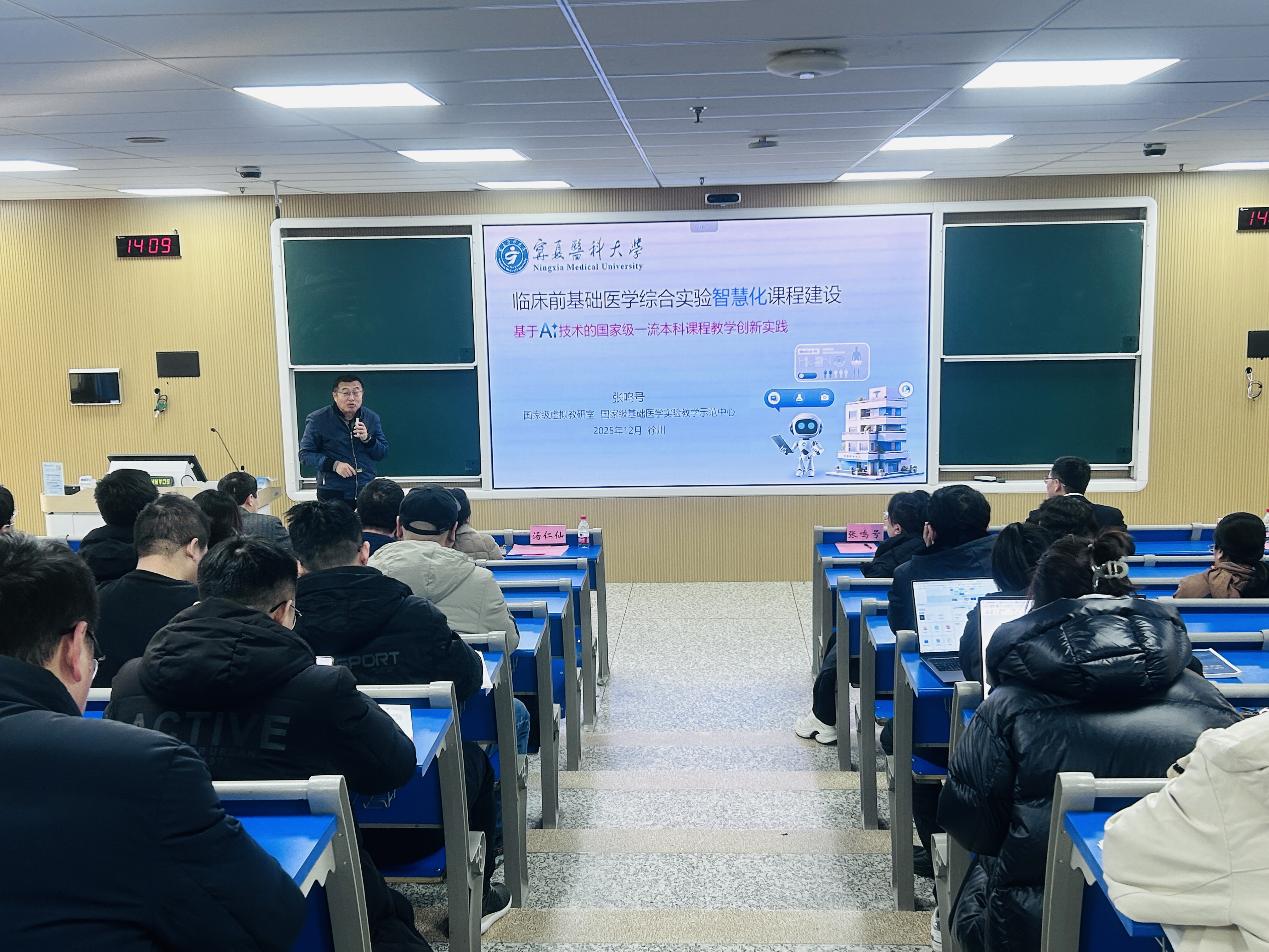 宁夏医科大学病理生理学系主任、国家级虚拟教研室负责人张鸣号教授受邀作《临床前基础医学综合实验智慧化课程建设-基于AI技术的国家级一流本科课程教学创新实践》专题报告。张教授分享了其带领团队创立《临床前基础医学综合实验》课程的过程,采用“虚拟+实体”教学模式,构建“AI助教-助学-助研-助管”全流程体系,实现虚拟教师定制、教案自动生成、实验报告批改、24小时智能答疑、知识图谱构建等功能,推动教师从教学的“主导者”转向“引导者”,为医学数智课程建设提供可复制范本和宝贵借鉴。