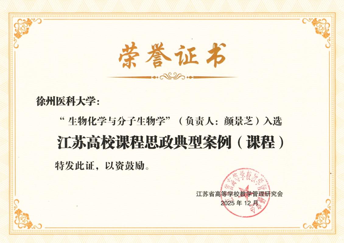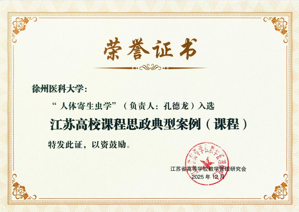 近日,江苏省高等学校教学管理研究会课程思政建设工作委员会公布了2025年江苏省普通本科高校课程思政典型案例评选结果,基础医学院《生物化学与分子生物学》和《人体寄生虫学》2门课程成功入选课程类典型案例。