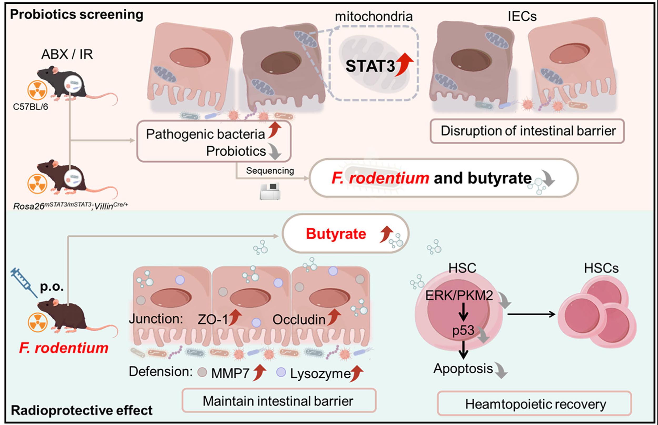 电离辐射可对机体造成严重损伤,尤其是肠道与造血系统。虽然肠道菌群在缓解辐射损伤中扮演关键角色,但其中起核心保护作用的具体菌种及其分子机制尚不明确。本研究发现,利用多种模型筛选得到的益生菌啮齿粪杆菌(Faecalibaculum rodentium)能够缓解辐射所致小鼠损伤。机制上,啮齿粪杆菌能够通过直接作用及间接作用促进丁酸的产生,一方面,丁酸通过上调紧密连接蛋白(如ZO-1和Occludin)和防御素水平,维持肠道上皮完整性;另一方面,丁酸可通过维持ERK介导PKM2入核,抑制造血干细胞中p53介导的细胞凋亡。通过上述作用,啮齿粪杆菌及其代谢产物最终可缓解电离辐射导致的肠道及骨髓损伤,降低小鼠死亡率。本研究为治疗电离辐射所致损伤提供了坚实的理论依据,为电离辐射的防护策略提供了新的思路,亦为益生菌在临床上的应用提供了数据支持。