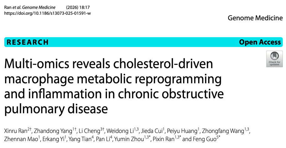 近日,我校江苏省免疫与代谢重点实验室在Genome Medicine(中科院1区top,IF=11.2)正式发表了题为“Multi-omics reveals cholesterol-driven macrophage metabolic reprogramming and inflammation in chronic obstructive pulmonary disease”的研究论文,徐州医科大学基础医学院郭峰教授为最后通讯作者。该研究工作得到国家自然科学基金、江苏省自然科学基金、广州国家实验室专项等项目资助。