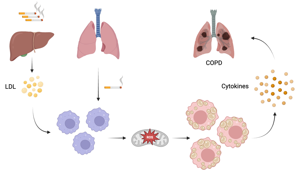 慢性阻塞性肺疾病(COPD)是一种以不可逆气流受限、气道重塑及肺泡结构破坏为主要特征的进行性炎症性疾病。近年来的研究表明,由全身性代谢异常与慢性炎症共同驱动的组织稳态失衡在COPD的发生发展中发挥关键作用,其中血脂代谢紊乱尤为突出。该研究通过对COPD患者血浆进行代谢组学分析,发现血浆胆固醇水平与肺功能指标FEV1%预测值及FEV1/FVC显著负相关,并随疾病严重程度逐步升高,提示胆固醇代谢失衡与肺功能下降密切相关。进一步的研究结果显示,香烟烟雾与胆固醇可协同发挥作用,显著损害肺泡巨噬细胞线粒体功能,诱导ROS过度生成,并上调Peptidylprolyl isomerase A(PPIA)表达,进而激活NF-κB信号通路,促进IL-1β释放,从而放大肺部炎症反应。